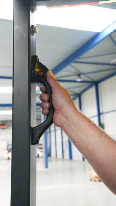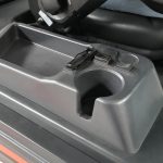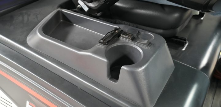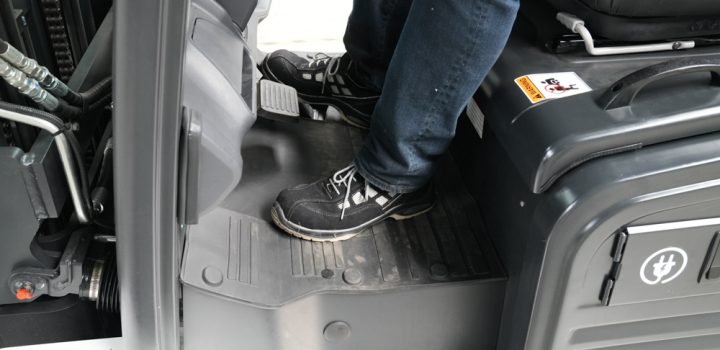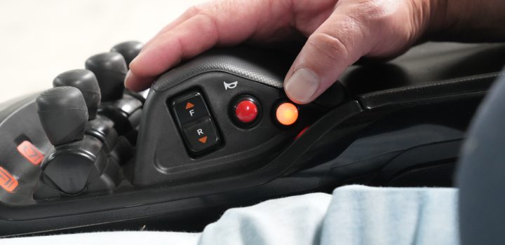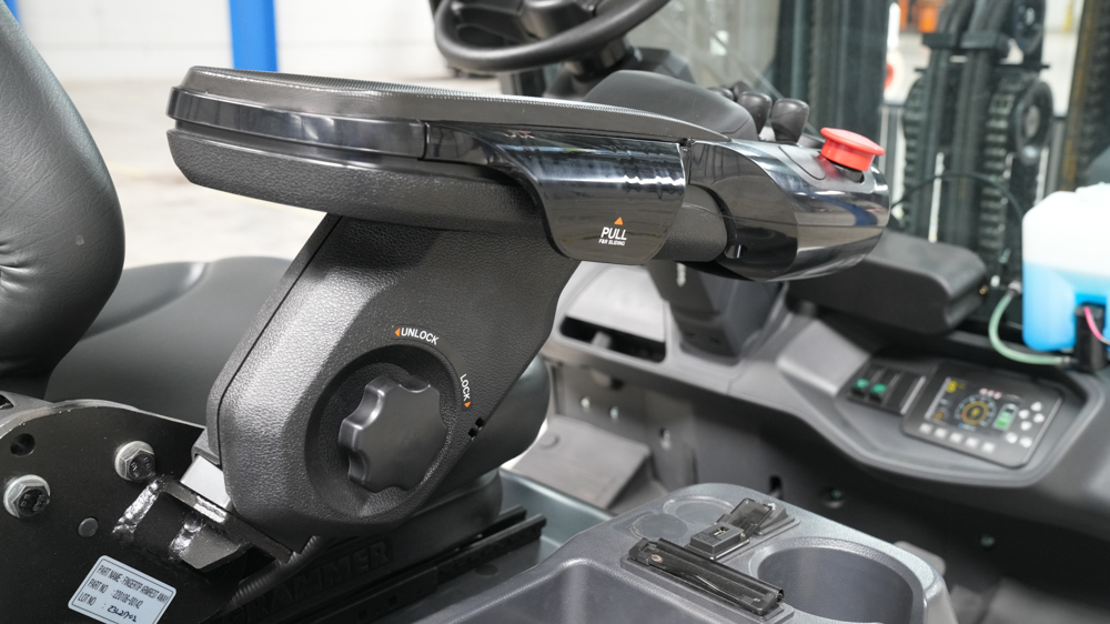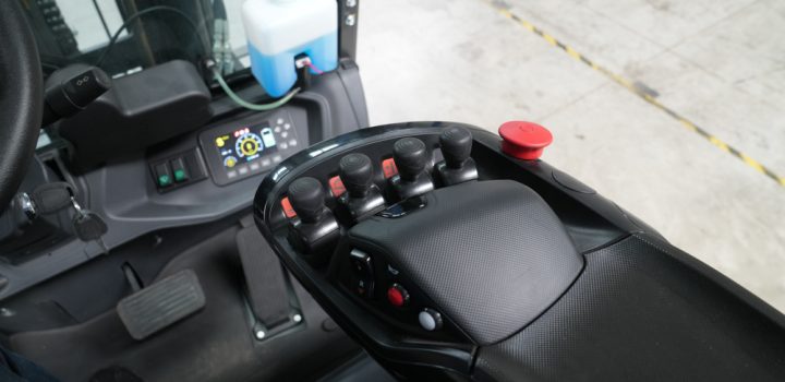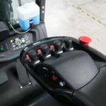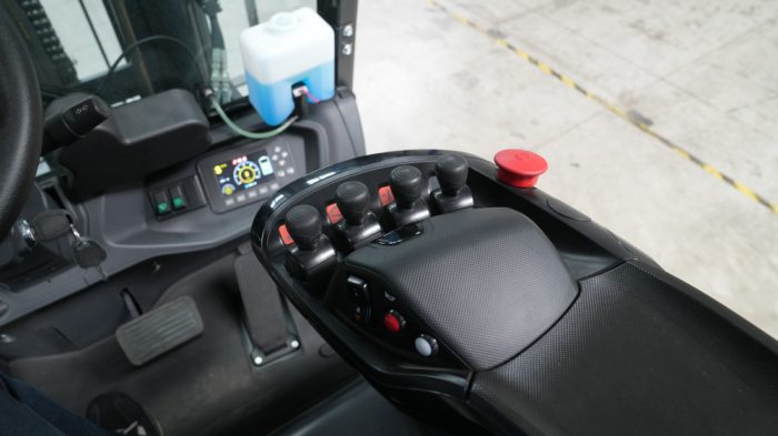 De ruime op-/afstap met antislip rooster en de lange handgreep zorgen voor een goede entree. De voetenplaat is uiterst riant en vrij van obstakels. De zitpositie is prima. De hoek van de stuurkolom is traploos verstelbaar en de Grammer MSG65 – met twee armleuningen – is goed instelbaar. Aan de rechter armleuning zien we de elektrische vingertop hendeltjes voor de mastbediening, de rijrichtingsschakelaar, claxon, noodstop en een drukknop voor automatische mastverticaalstelling. Aan de dakstijl rechtsachter treffen we een handgreep met claxon.