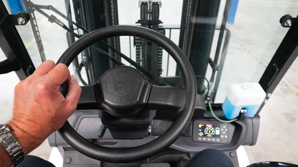 Wat de uitrusting betreft is het goed toeven op deze ‘light’ Bobcat, maar hoe werkt hij? Afgezien van een vrij nadrukkelijk hoorbare stuurpompmotor is dat overwegend voorspelbaar en dus in orde. Het zicht door de uiterst stabiele en robuuste driedelige mast is verhoudingsgewijs goed, ondanks de drie mastdelen, side shift en vrije hefcilinder. De mastbediening is nauwkeurig te regelen met de vingertop hendeltjes en de mastdemping is goed. De rijrichting kiezen we makkelijk met de rechterduim. De extra knop voor de mastverticaalstelling werkt prima, zowel bij voor- als achterover neigen stopt de mast netjes in verticale positie.