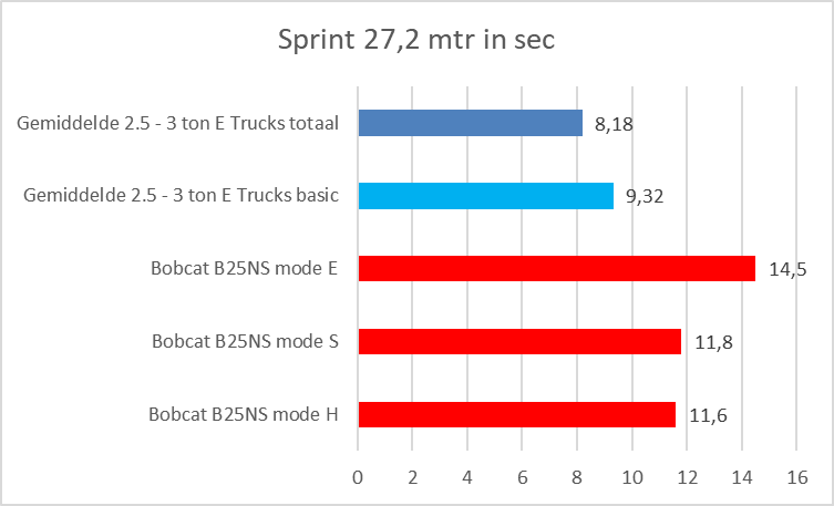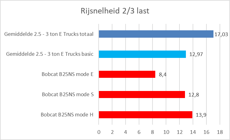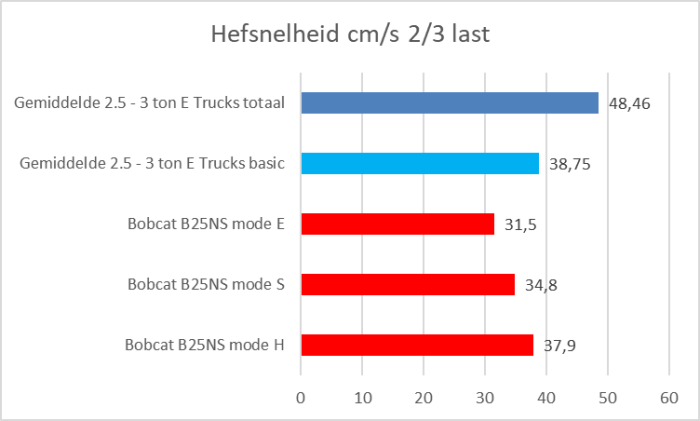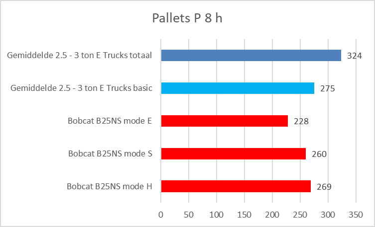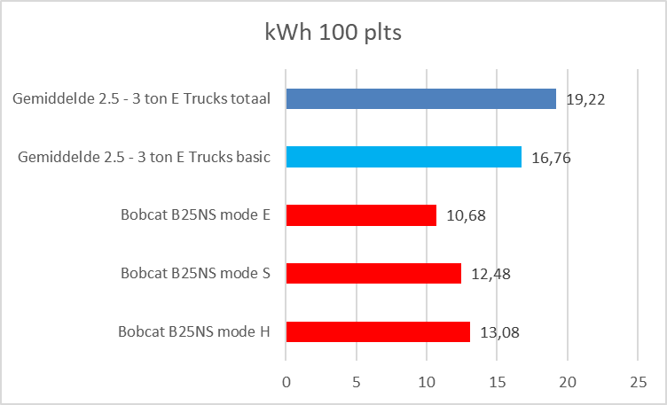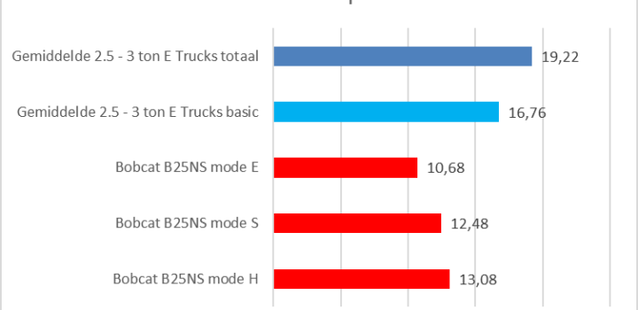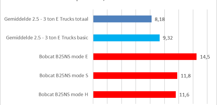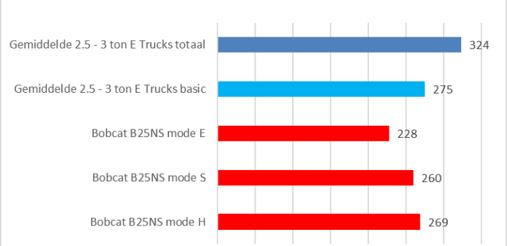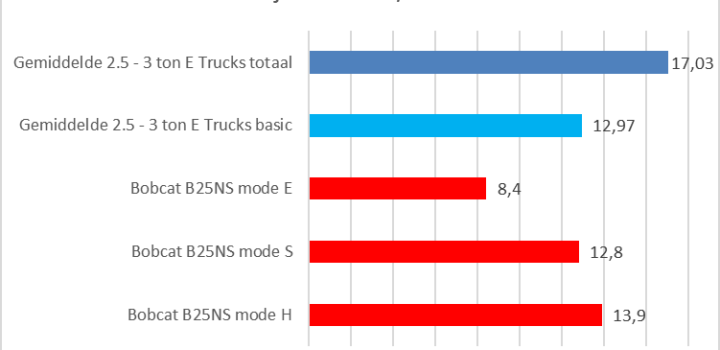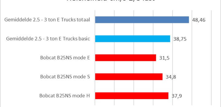 Wat de prestaties betreft scoort de Bobcat B25NS in lijn met de gewekte verwachting. Vergeleken met geteste 2,5 tons elektrische heftrucks voor de intensievere inzet scoort deze Bobcat in de maximale stand H een bescheiden productiviteit, maar ook een uiterst bescheiden energieverbruik. Vergeleken met trucks die zijn bestemd voor de gemiddelde tot lichte inzet, komt de B25NS dichter in de buurt van het gemiddelde. Hij is iets minder productief, maar wel economischer.